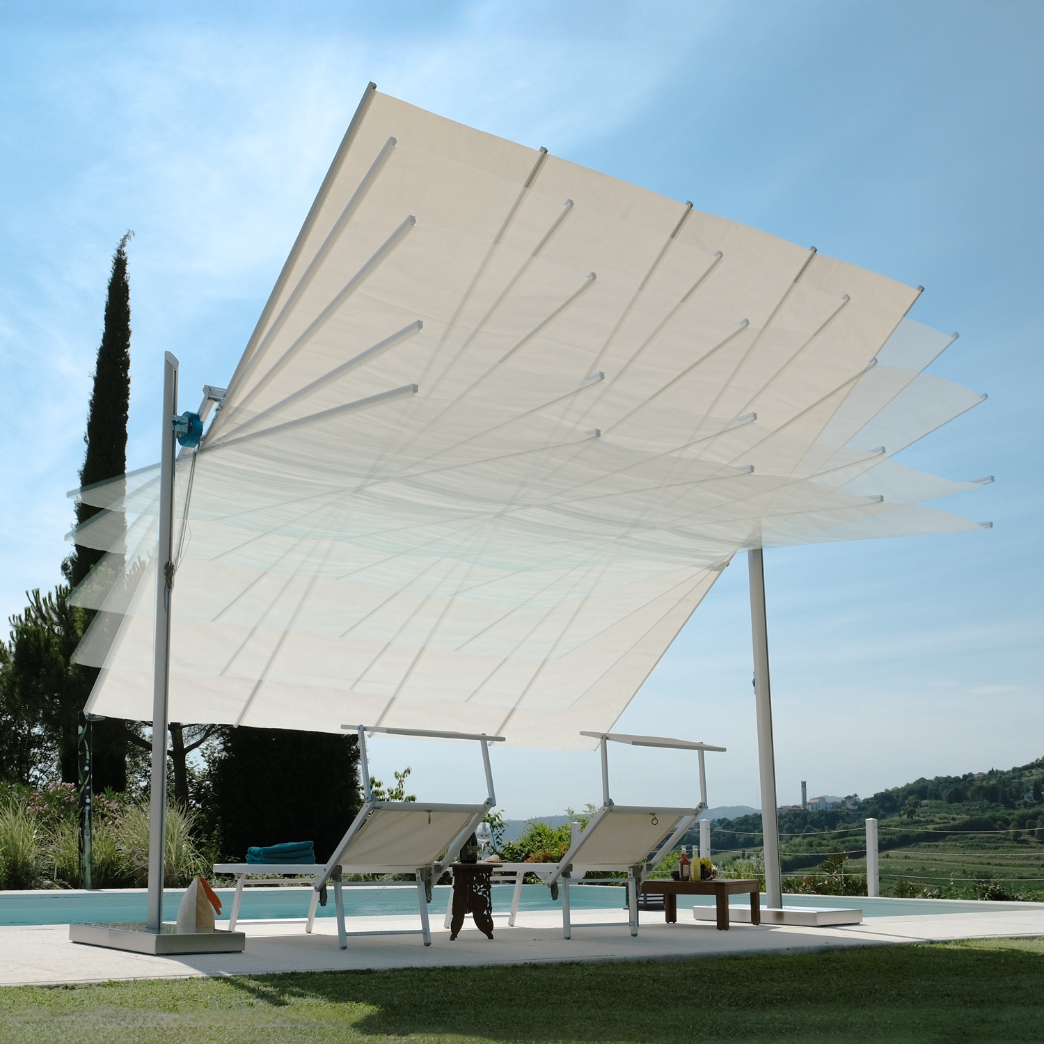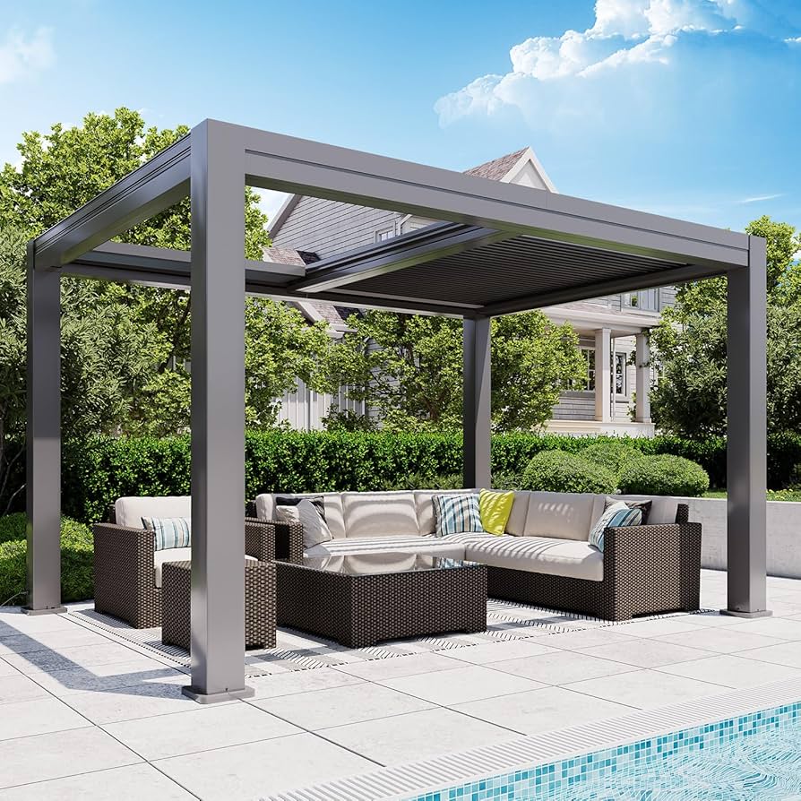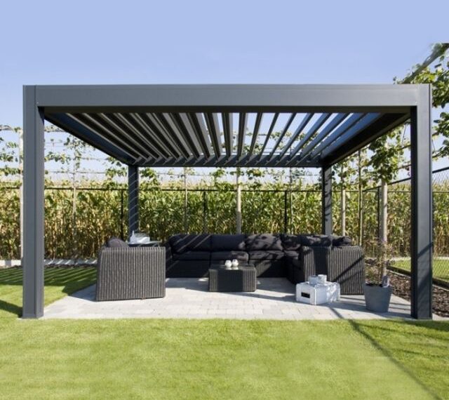 No fixed glazing — roof formed by adjustable aluminum louvers. Optional polycarbonate or glass infills for side panels.